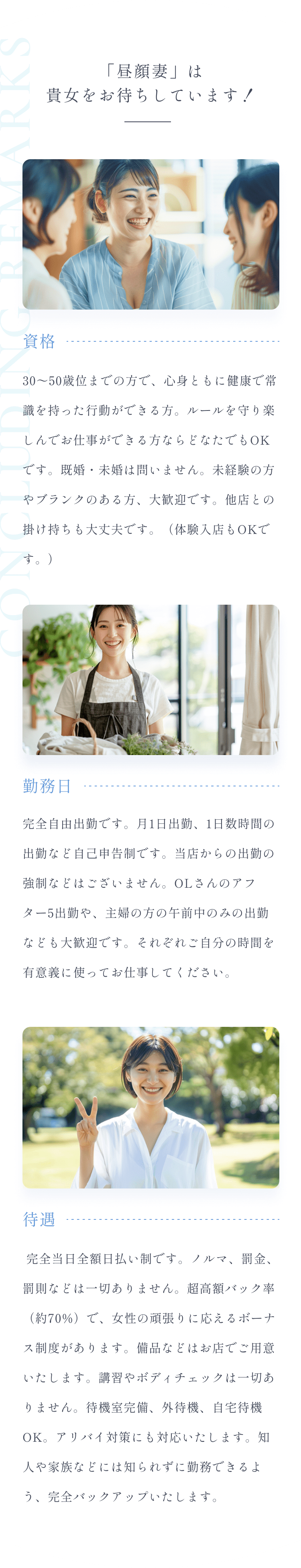 そのため当店ではグループ店にはできない、女性ひとりひとりに寄り添った営業スタイルを確立し徹底的にサポートしていく体制を整えてきました。 ライフスタイルは個人それぞれで異なります。 ご自分のスタイルをそのままに崩すことなく、効率よく、目標に向かってお仕事をしていく貴女を当店は全力で応援します。